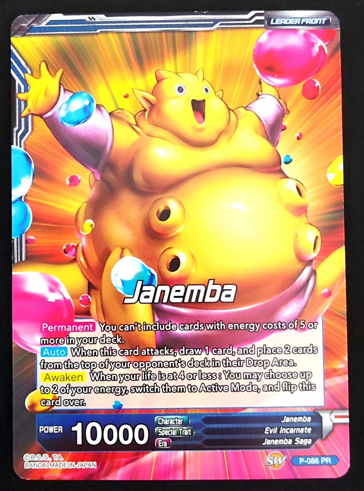 Dragon Ball Super Card Game brings you the powerful Relentless Speed Janemba in English foil. This promo card, numbered P-086...