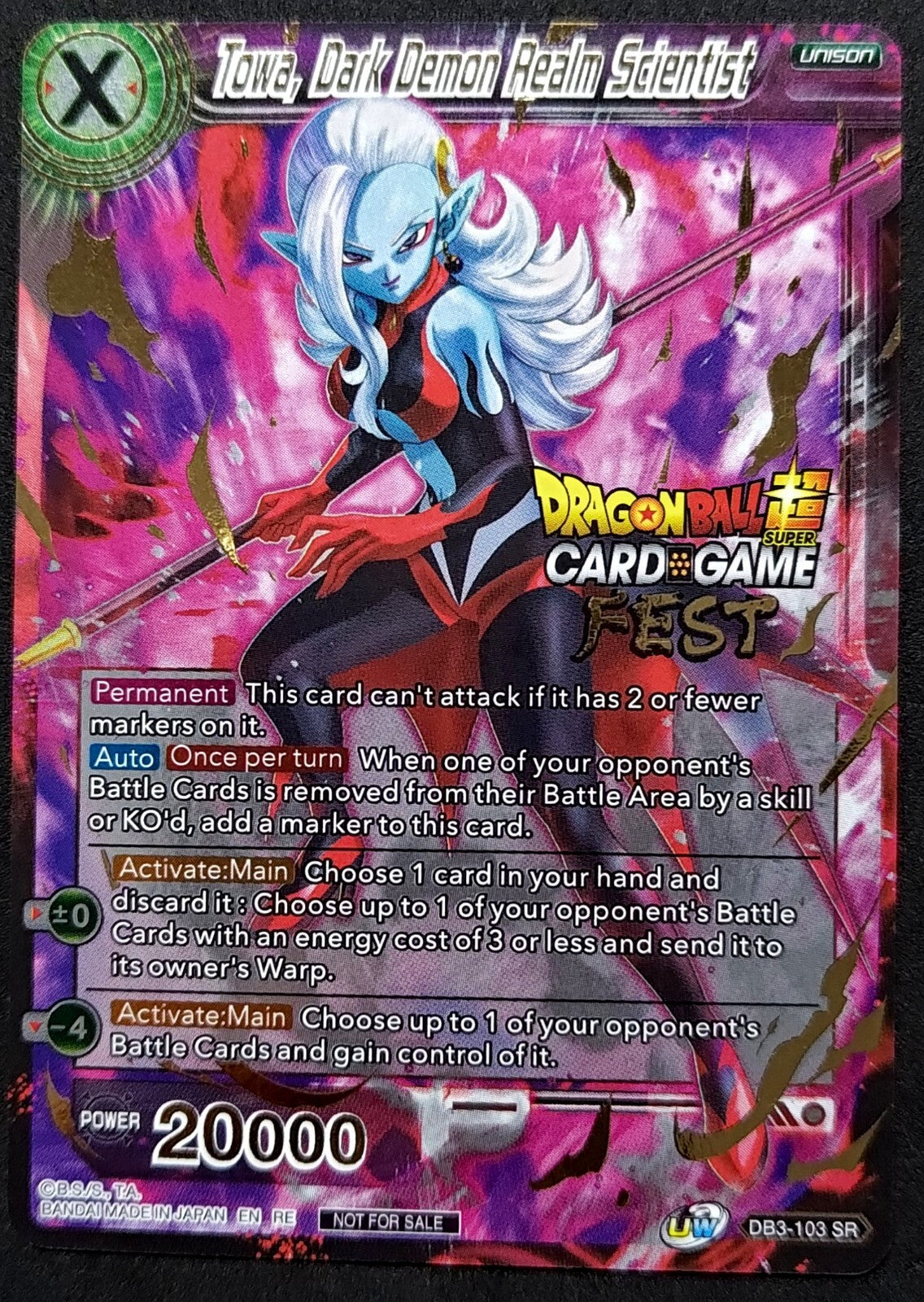 Dragon Ball Super fans, add Towa, the Dark Demon Realm Scientist, to your card collection with this rare DB3-103 SR...