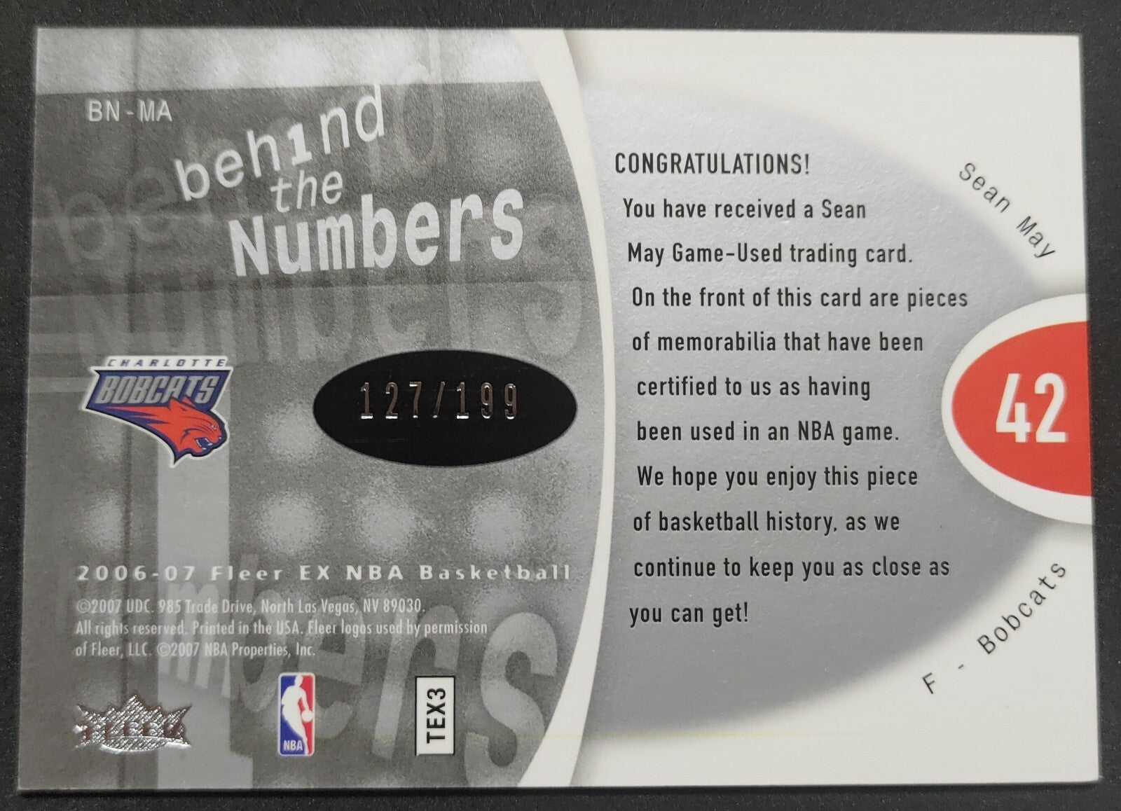 NBA - 2006-07 Fleer EX Behind The Numbers Sean May 127/199 Patch Card. Card is in NM condition, however, please...