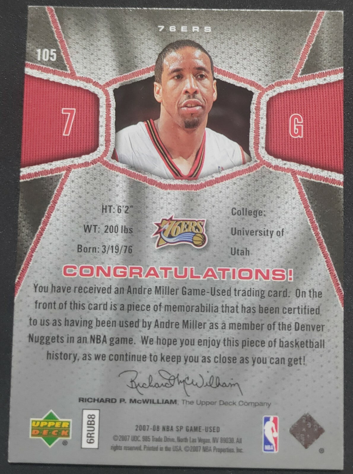 NBA - 2007-08 SP Game Used Andre Miller Patch Card. Card is in EXC condition, however, please use photos to...