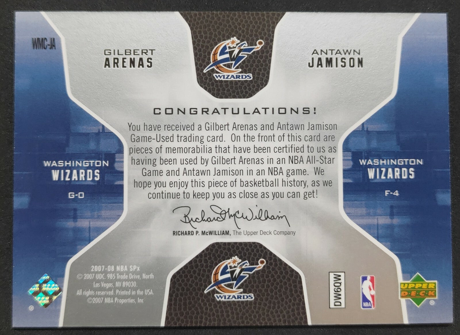 NBA - 2007-08 SPx Winnings Materials Gilbert Arenas/Antawn Jamison Dual Patch Card. Card is in NM condition, however, please use...