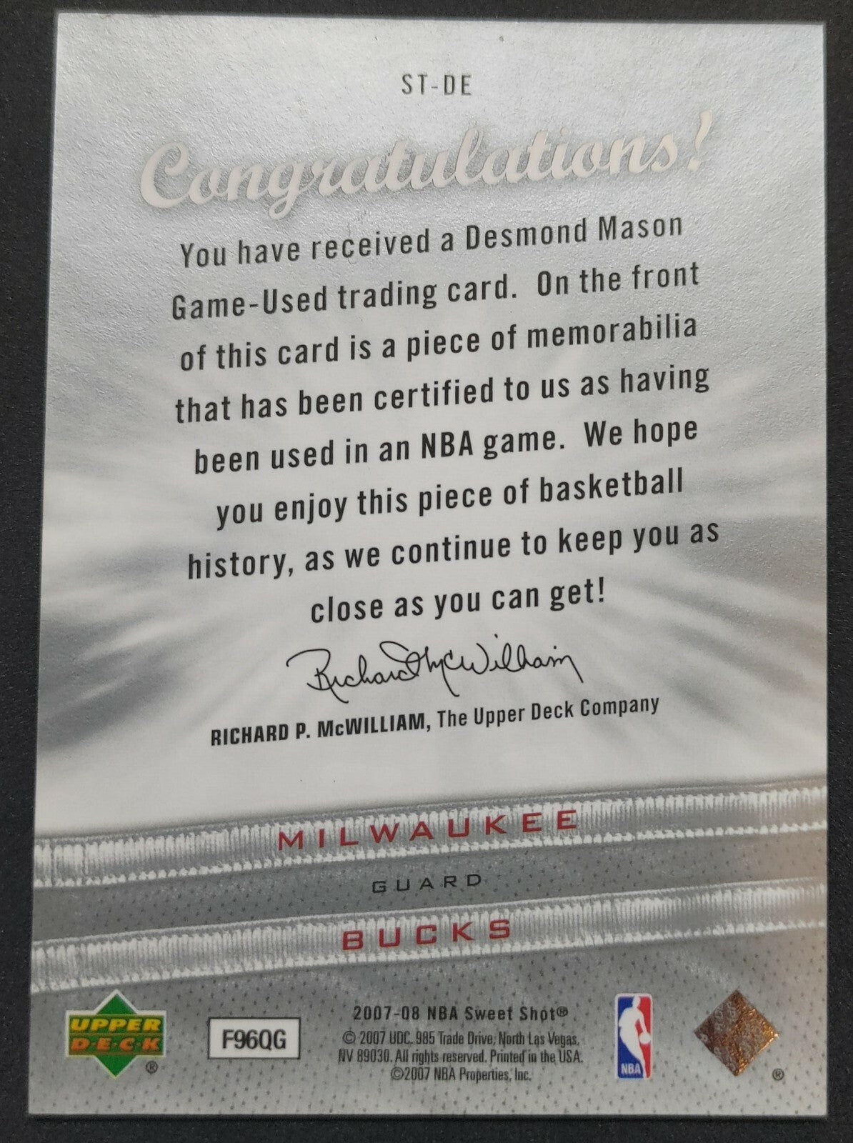 NBA - 2007-08 Sweet Shot Sweet Stitches Desmond Mason Patch Card. Card is in NM condition, however, please use photos...