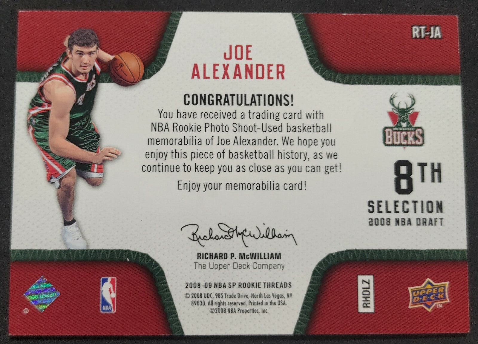 NBA - 2008-09 SP Rookie Threads Joe Alexander Dual Patch Card. Card is in NM condition, however does have very...