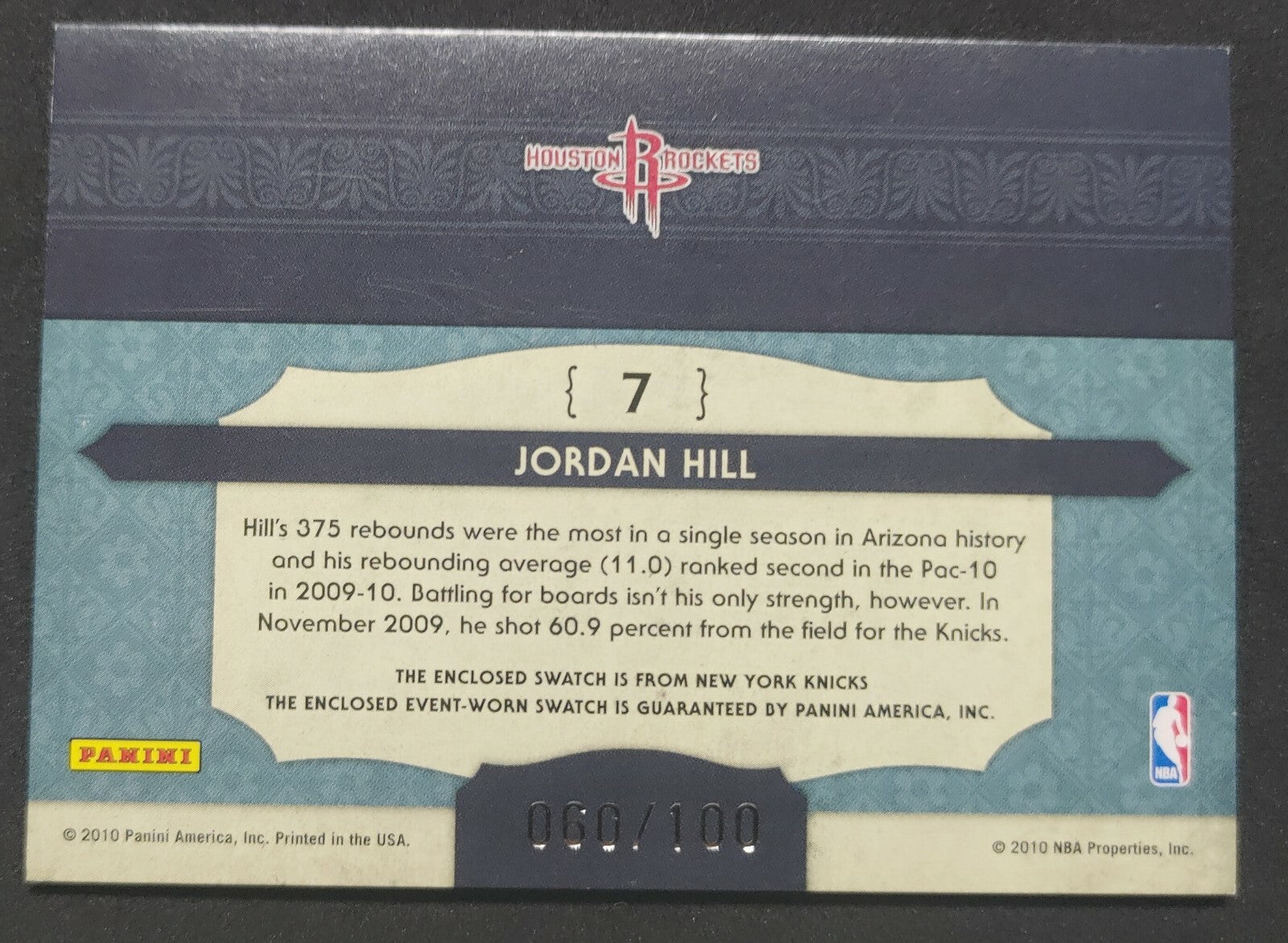 NBA - 2010 Panini NBA Apprentice Jordan Hill 060/100 Patch Card. Card is in EXC condition, however, please use photos...