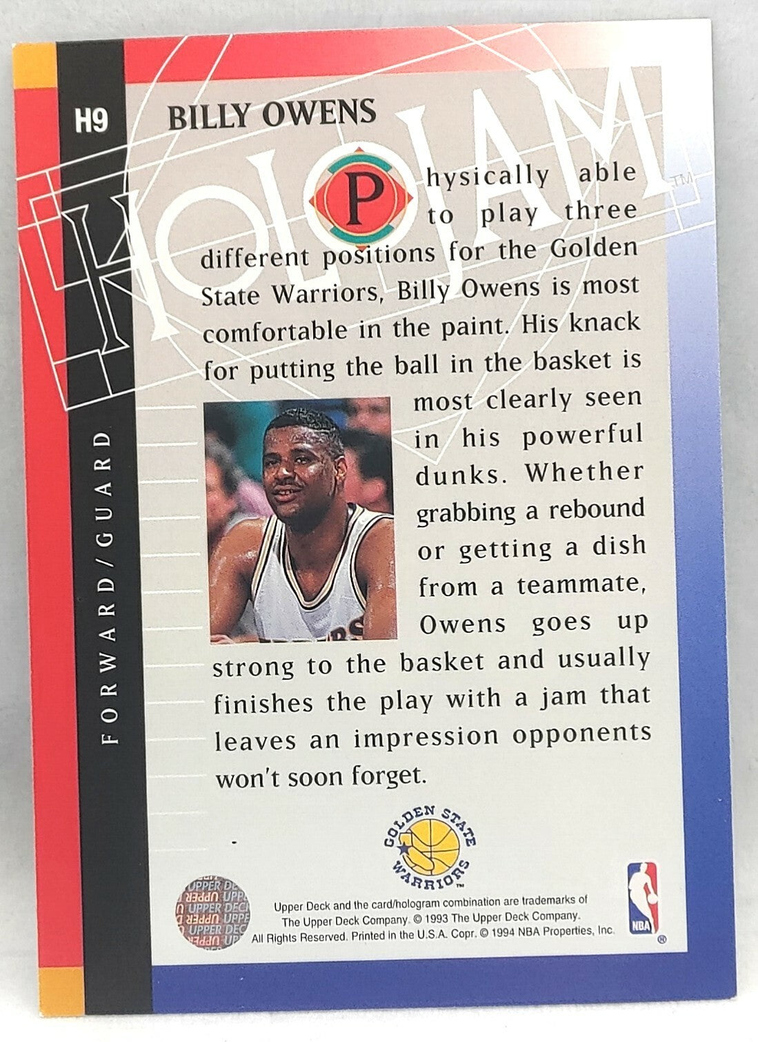 NBA - Billy Owens Holojam H9 1993 Upper Deck NM/M Card. Card is in NM/M condition. Card will be sent...