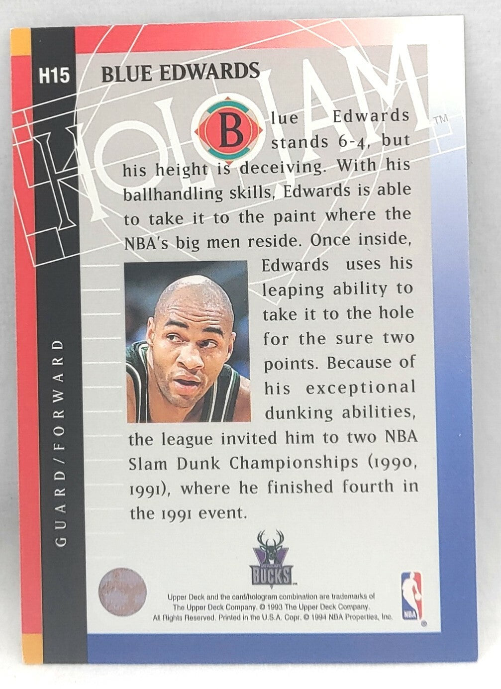NBA - Blue Edwards Holojam H15 1993 Upper Deck NM/M Card. Card is in NM/M condition. Card will be sent...