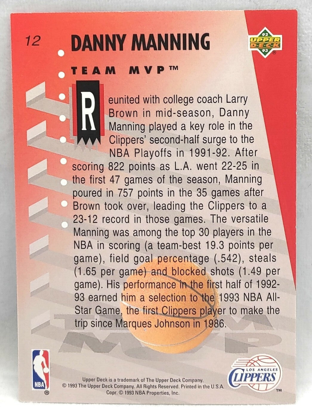 NBA - Danny Manning 1992 MVP Holograms #12 Upper Deck NM/M Card. Card is in NM/M condition. Card will be...