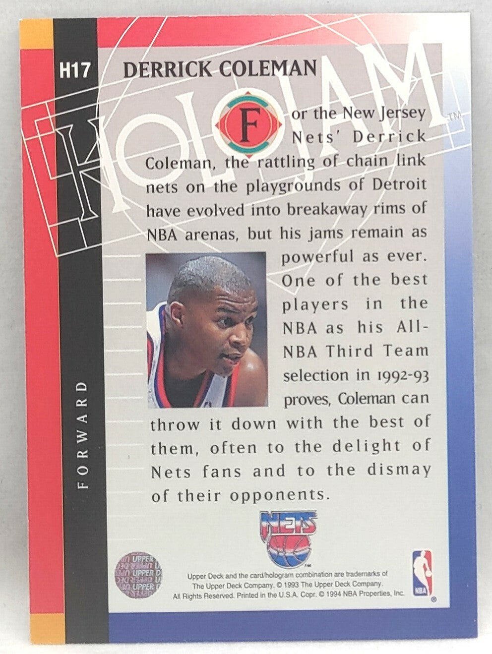 NBA - Derrick Coleman Holojam H17 1993 Upper Deck NM/M Card. Card is in NM/M condition. Card will be sent...