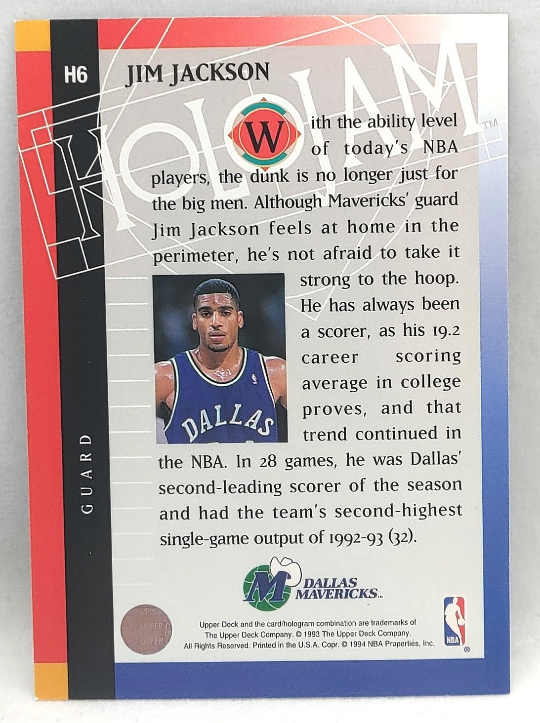 NBA - Jim Jackson Holojam H6 1993 Upper Deck NM/M Card. Card is in NM/M condition. Card will be sent...