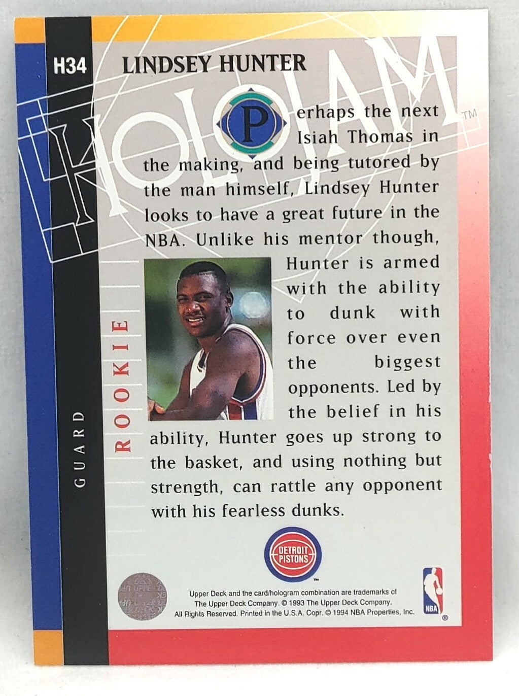 NBA - Lindsay Hunter Holojam H34 1993 Upper Deck NM/M Card. Card is in NM/M condition. Card will be sent...