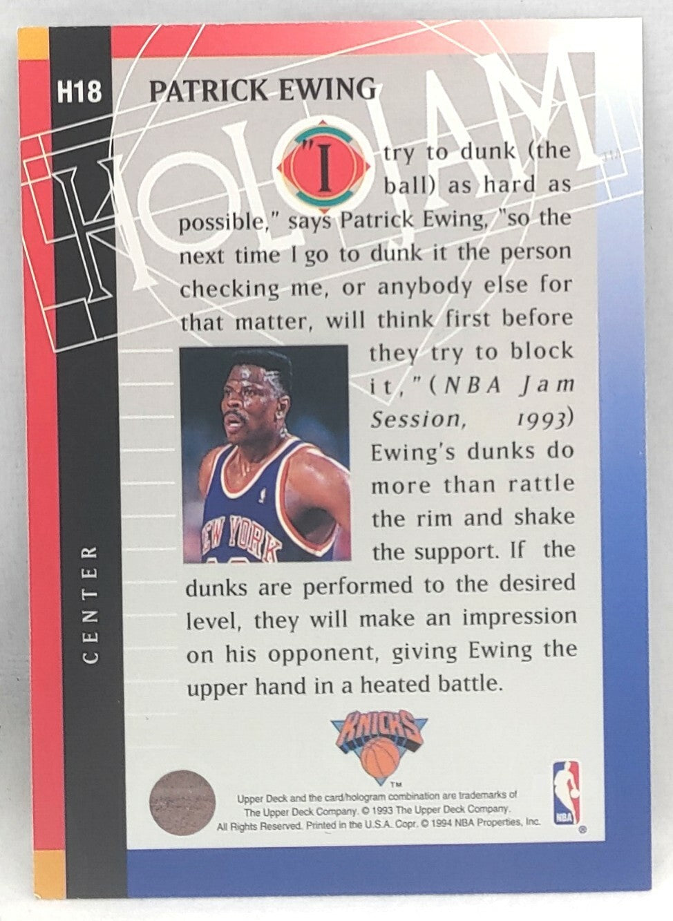 NBA - Patrick Ewing Holojam H18 1993 Upper Deck NM/M Card. Card is in NM/M condition. Card will be sent...