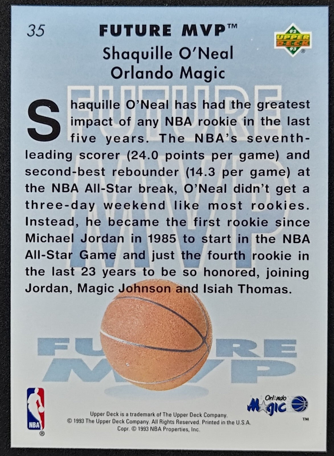 – Sold OutNBA fans rejoice! This 1992-93 Upper Deck Shaquille O'Neal MVP Hologram Future MVP #35 trading card is a must-have for...