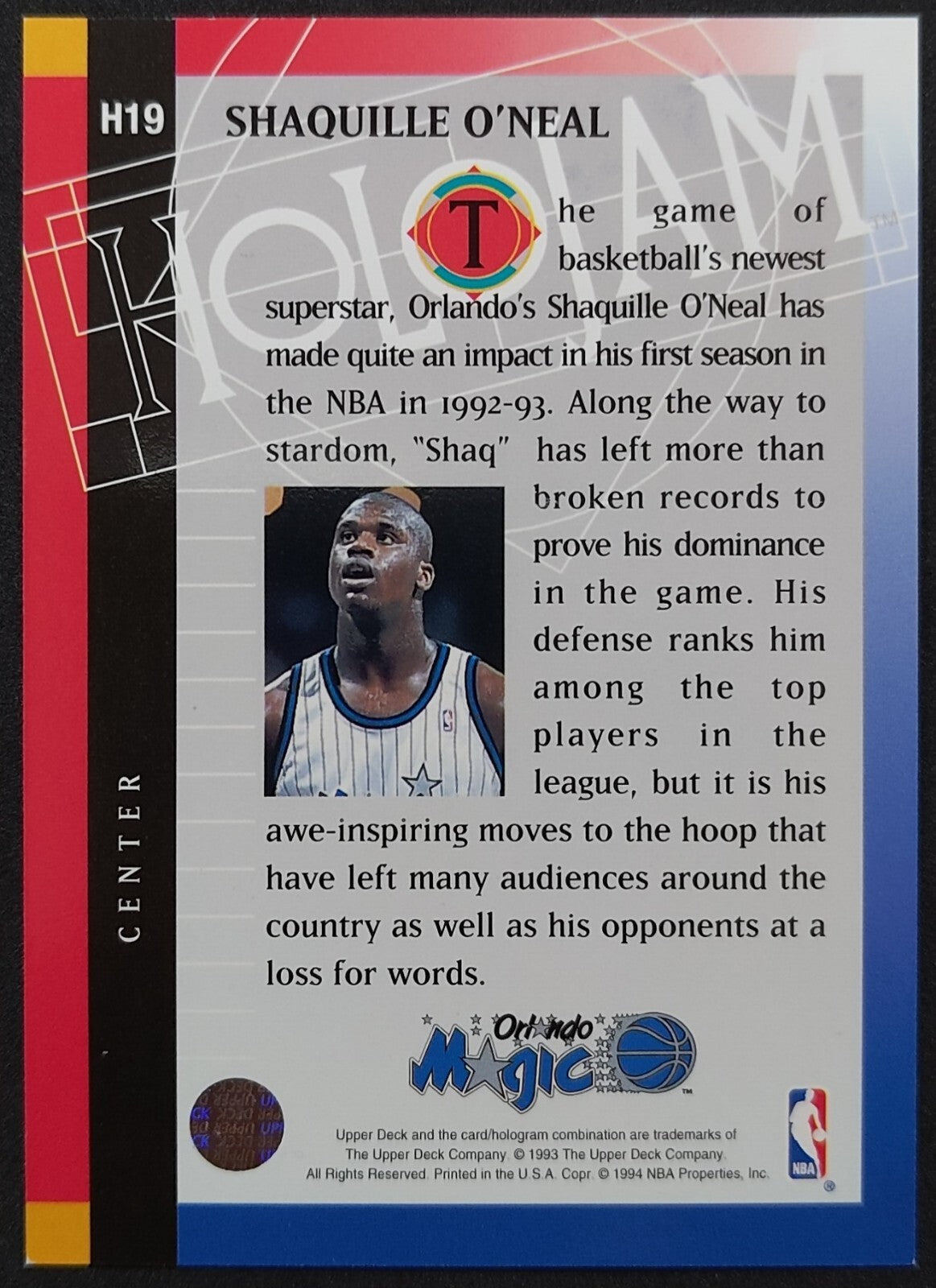 This 1993/94 Upper Deck Shaquille O'Neal Holojam H19 trading card is a must-have for any basketball fan or collector. Featuring...