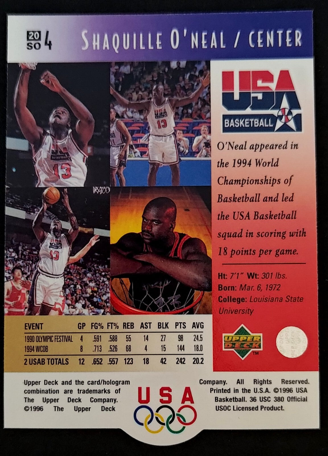 NBA - 1996 Upper Deck USA presents a Shaquille O'Neal #SO20 4 Die Cut NM/M Card. This sports trading card...