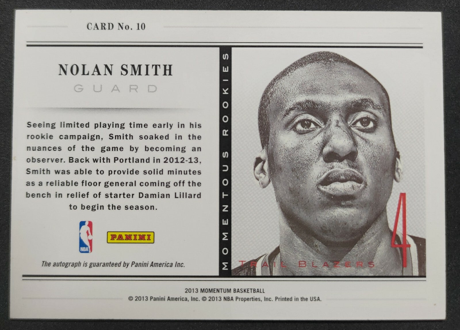 NBA - 2013 Panini Momentous Rookies Nolan Smith 12/49 Autographed Card. Card is in NM condition, however, please use photos...