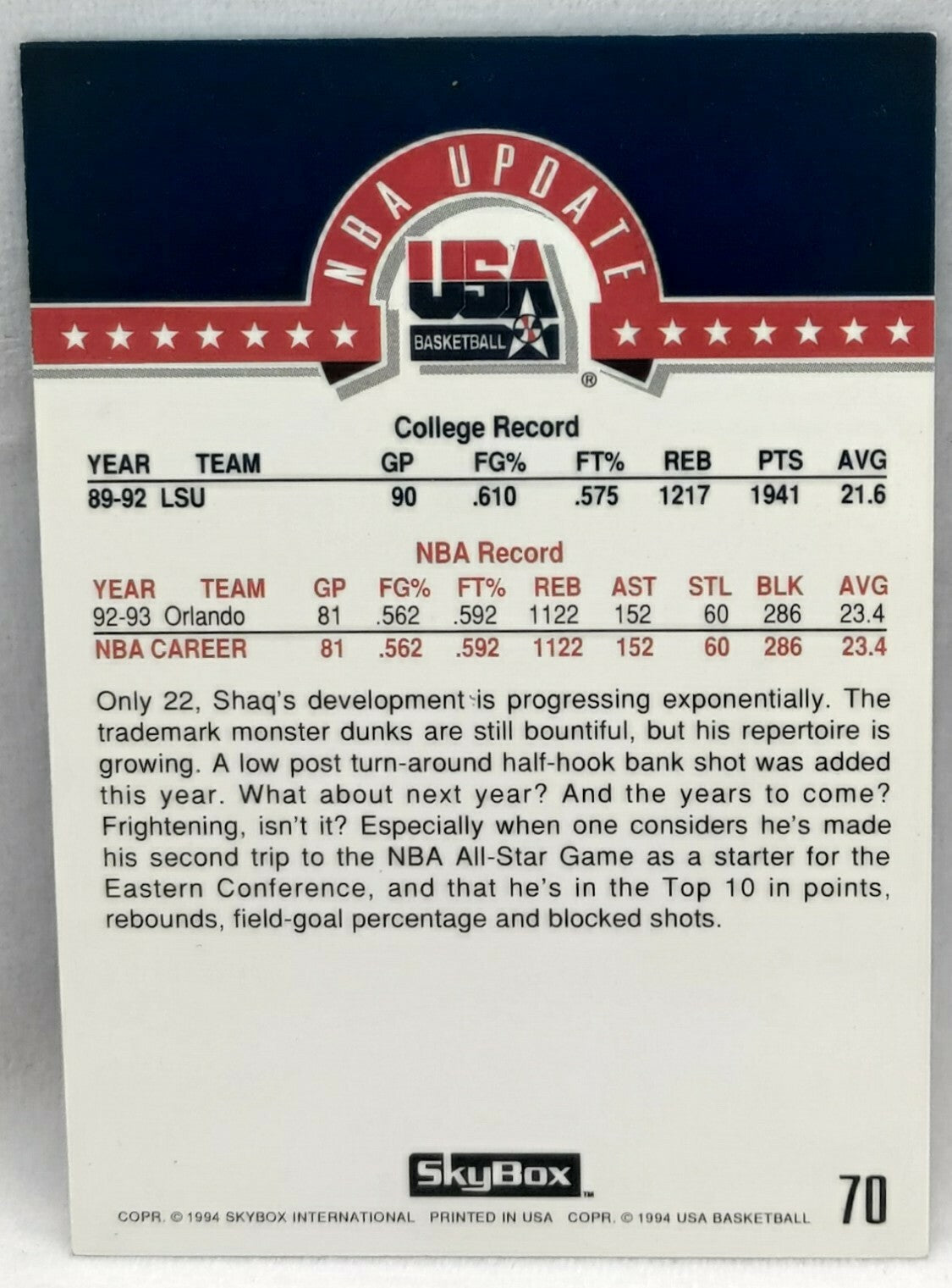 NBA - Shaquille O'Neal 1994 Skybox USA #70 NM/M Card. Card is in NM/M condition, however, please use photos to...