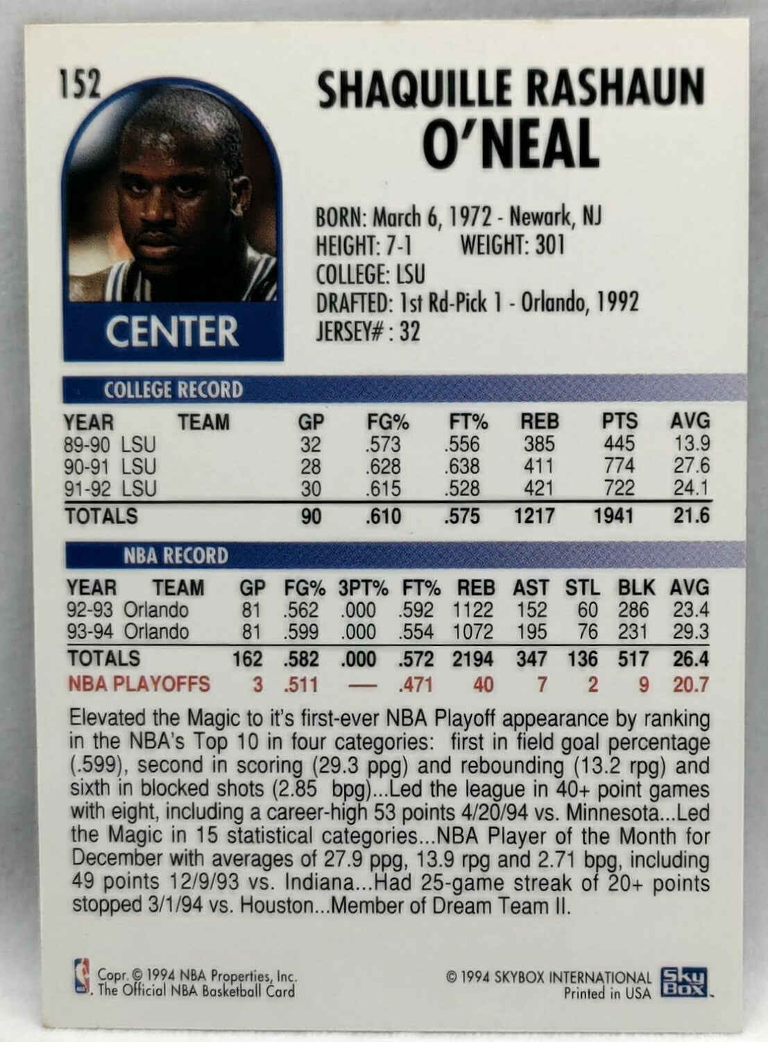 NBA - Shaquille O'Neal 1994-95 NBA Hoops #152 NM/M Card. Card is in NM/M condition, however, please use photos to...