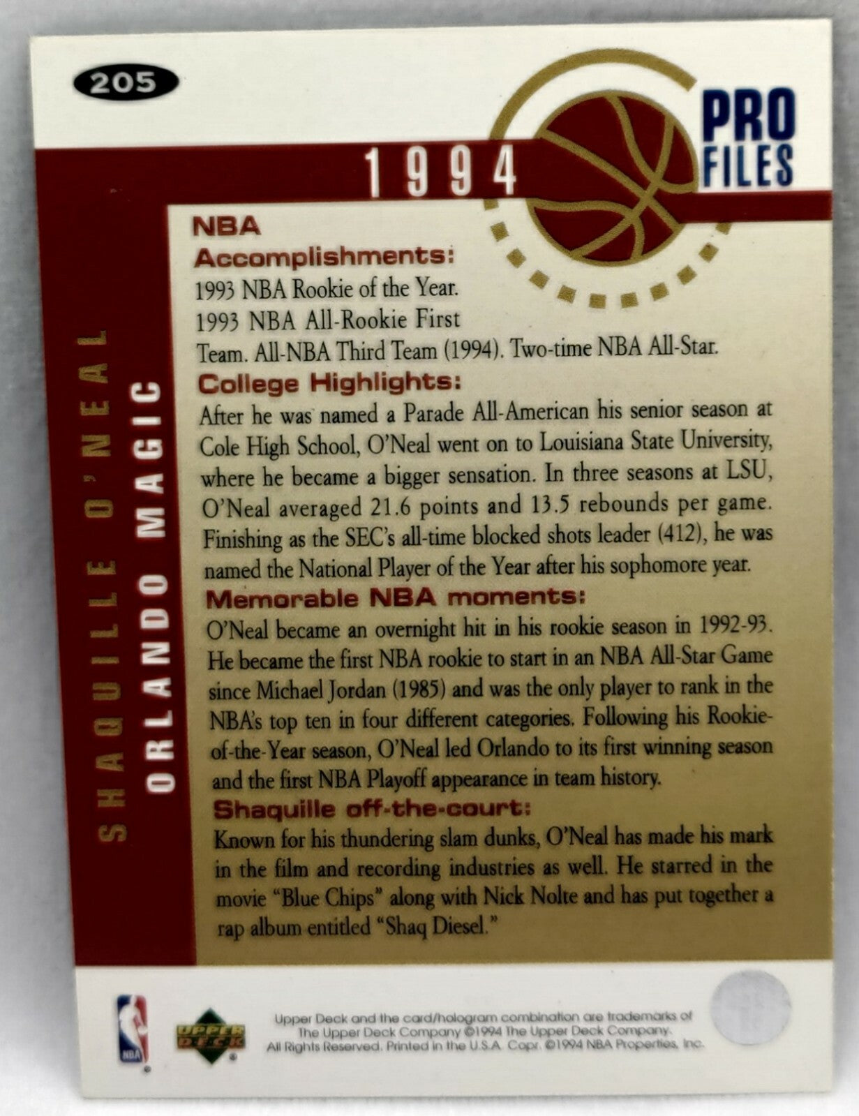 NBA - Shaquille O'Neal 1994-95 Upper Deck #205 Card. Card is in Exc condition. Being a listing with multiple available,...