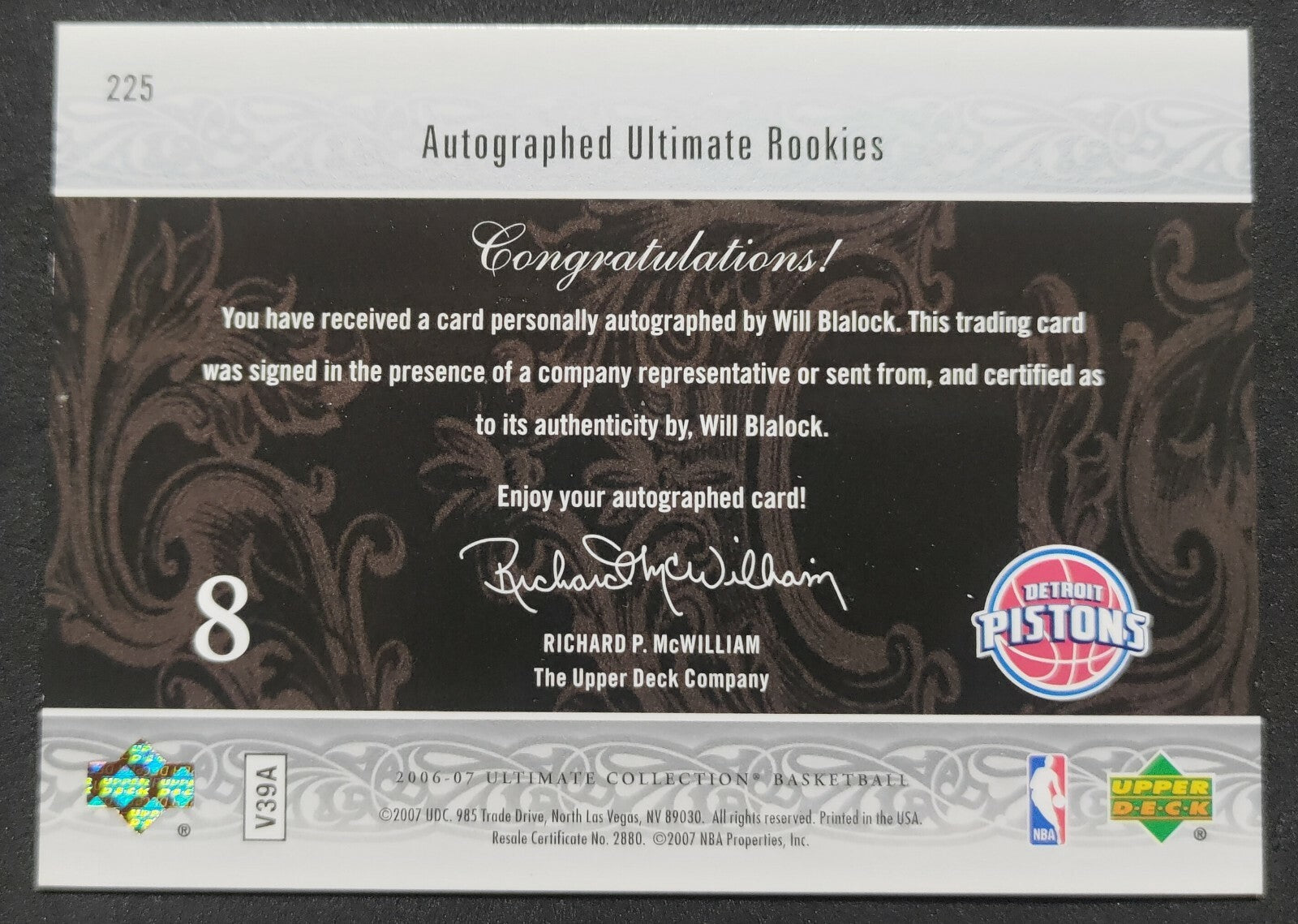 NBA - Will Blalock 2006 - 07 Ultimate Collection Autographed Rookies #327/350 NM Card Card will be sent sleeved and...