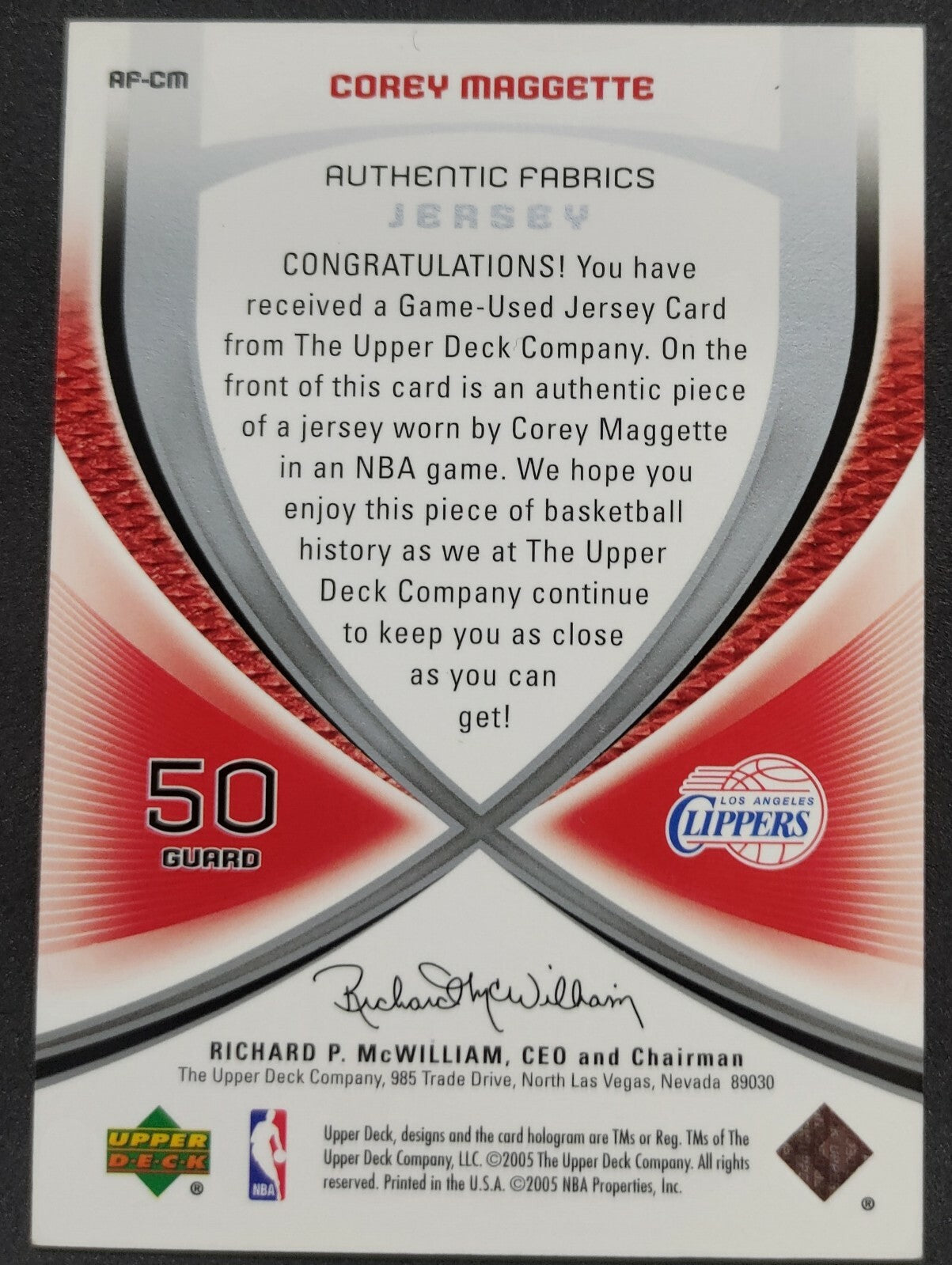 NBA - 2005 SP Game Used Authentic Fabrics Corey Maggette Patch Card. Card is in NM condition, however, please use...