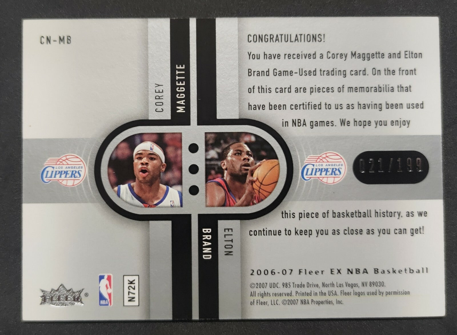 NBA - 2006-07 Fleer Ex ConnEXions Corey Maggette/Elton Brand Dual Patch 021/199. Card is in NM condition, however, please use...