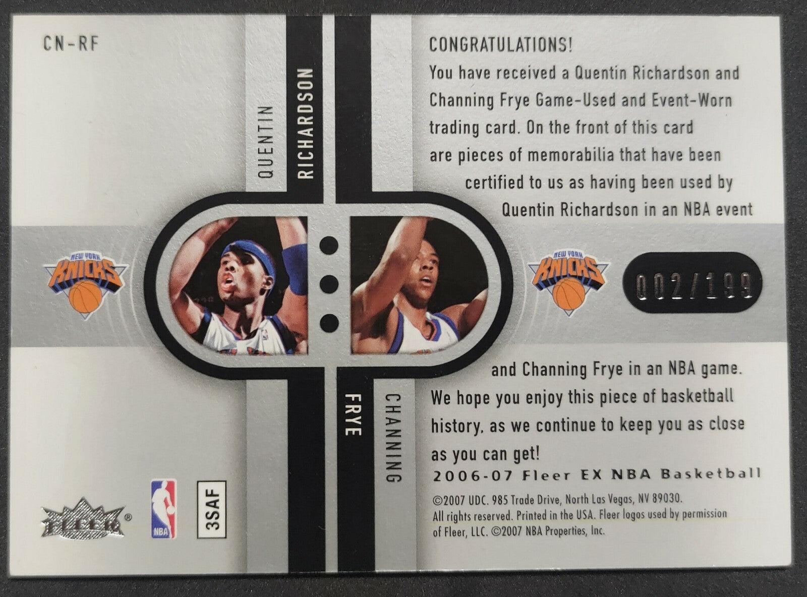 NBA - 2006-07 Fleer Ex ConnEXions Quentin Richardson/Channing Frye Dual Patch 002/199. Card is in NM condition, however, please use...