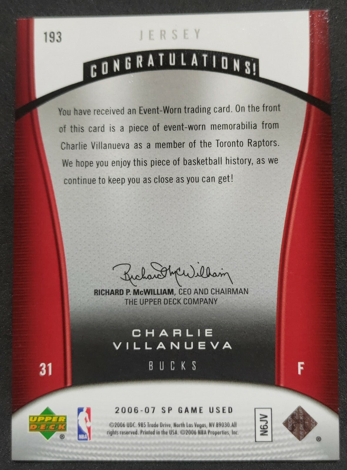 NBA - 2006-07 SP Game Used Charlie Villanueva Patch Card. Card is in NM condition, however, please use photos to...