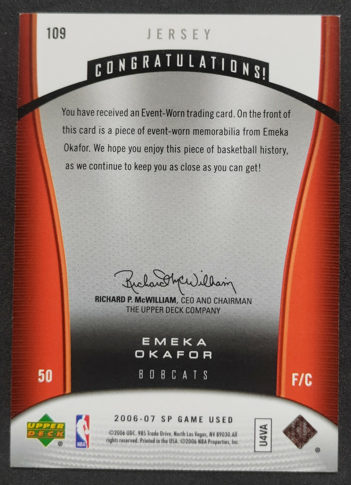 NBA - 2006-07 SP Game Used Emeka Okafor Patch Card. Card is in NM condition, however, please use photos to...
