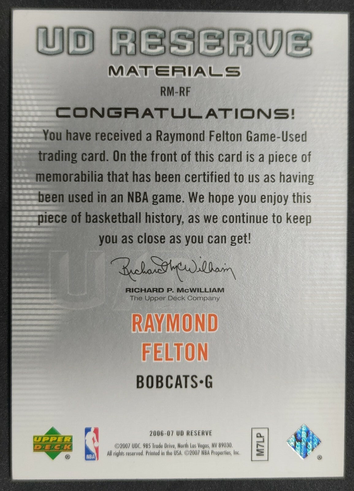 NBA - 2006-07 UD Reserve Materials Raymond Felton 026/100 Patch Card. Card is in NM condition, however, please use photos...