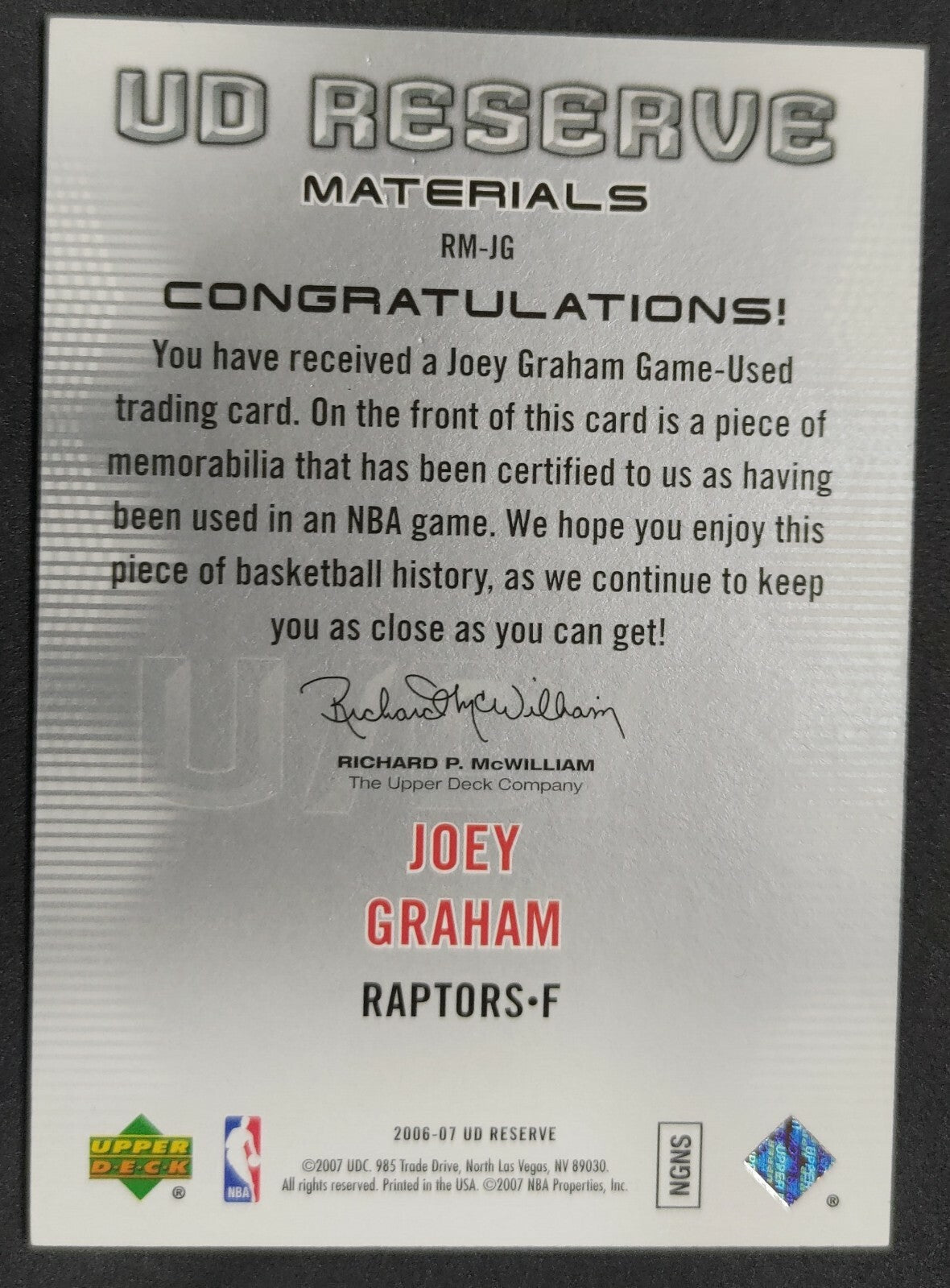 NBA - 2006-07 UD Reserve Materials Joey Graham 009/100 Patch Card. Card is in NM condition, however, please use photos...