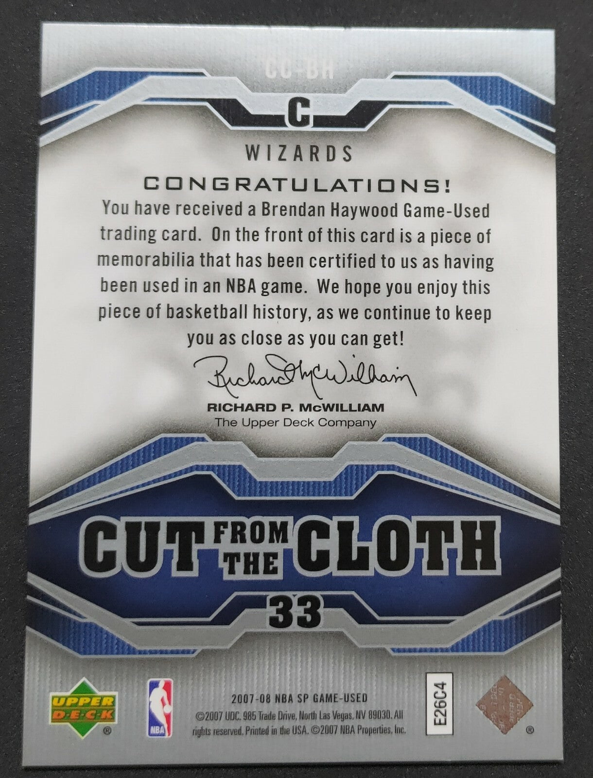 NBA - 2007-08 SP Cut From Cloth Brendan Haywood Patch Card. Card is in NM condition, however, please use photos...