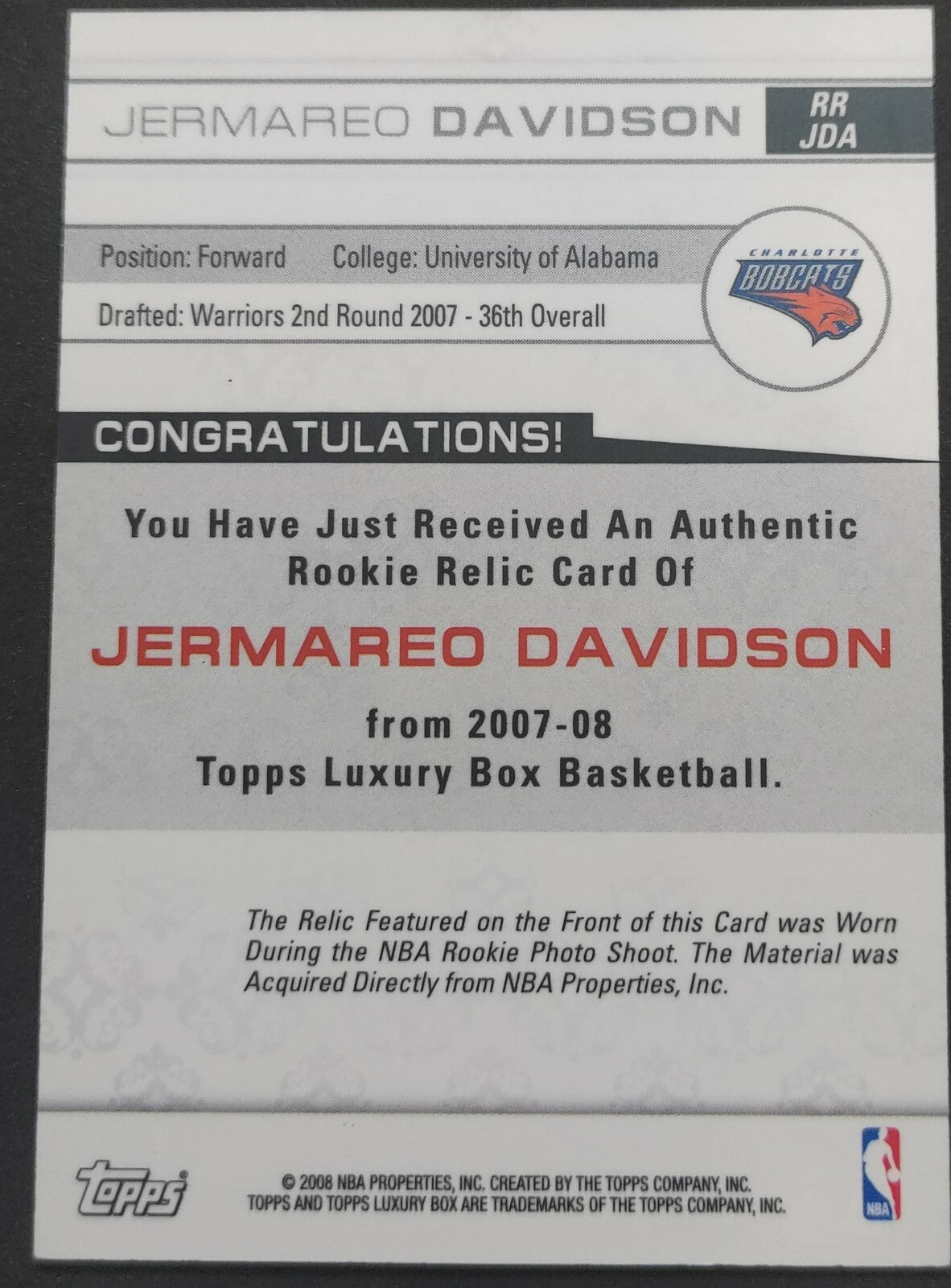 NBA - 2007-08 Topps Luxury Box Rookie Jermareo Davidson 079/149 Patch Card. Card is in NM condition, however, please use...