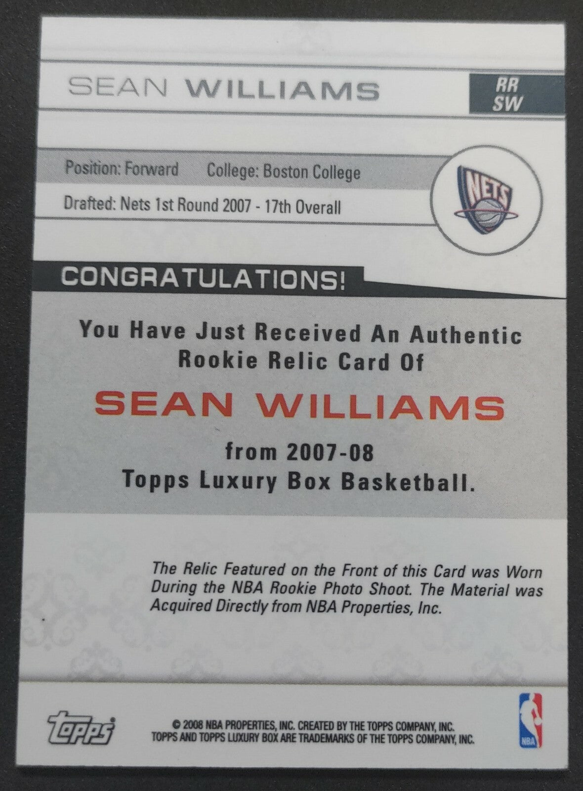 NBA - 2007-08 Topps Luxury Box Rookie Sean Williams 085/499 Patch Card. Card is in NM condition, however, please use...