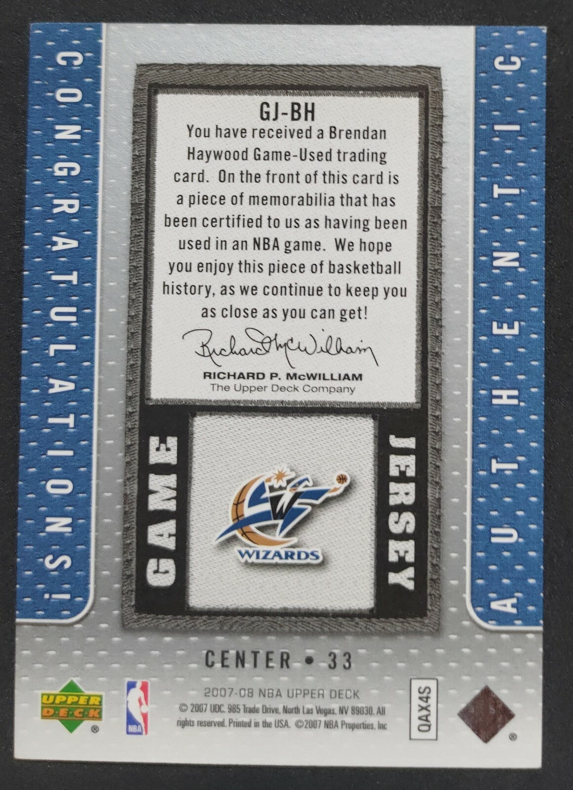 NBA - 2007-08 Upper Deck Game Jersey Brendan Haywood Patch Card. Card is in NM condition, however, please use photos...