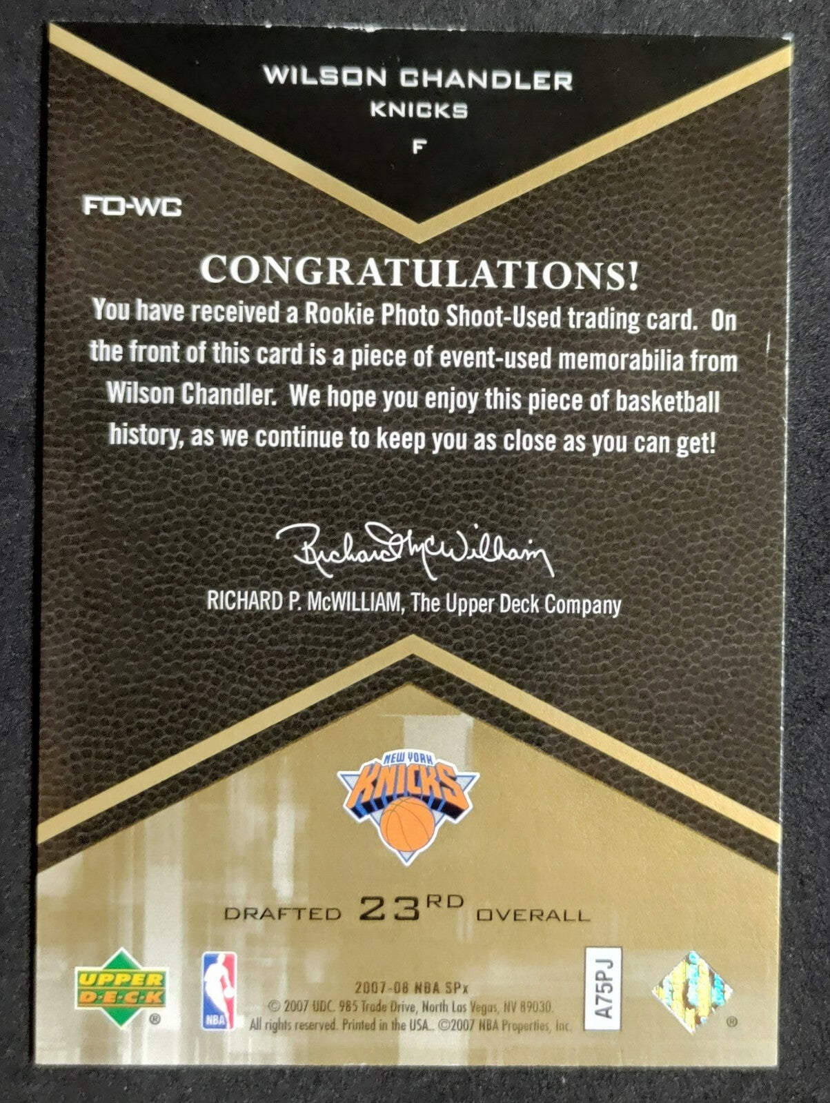 NBA - 2007 SPx Freshman Orientation Wilson Chandler Patch Card. Card is in NM condition, however, please use photos to...