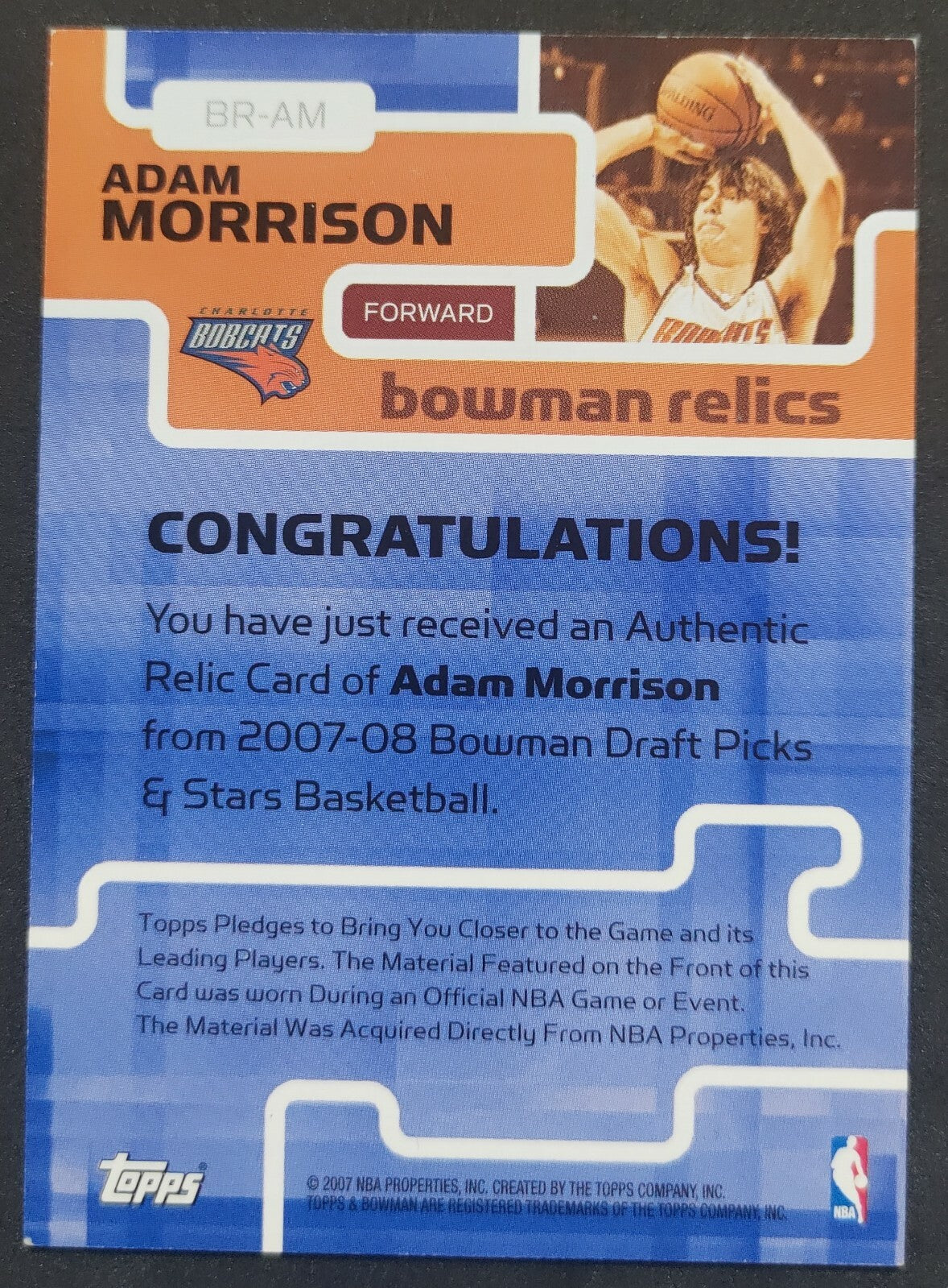 NBA - 2007 Topps Bowman Relics - Adam Morrison Patch Card. Card is in NM condition, however, please use photos...