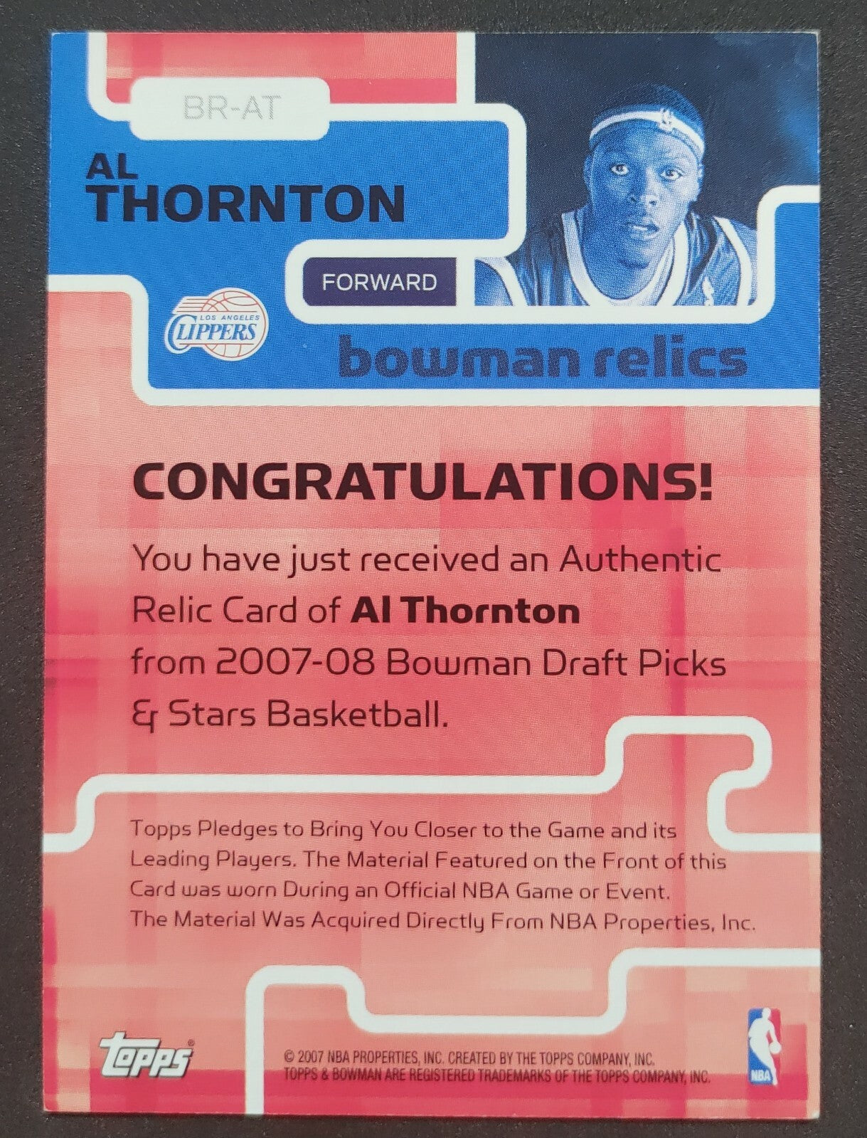 NBA - 2007 Topps Bowman Relics - Al Thornton Patch Card. Card is in NM condition, however, please use photos...