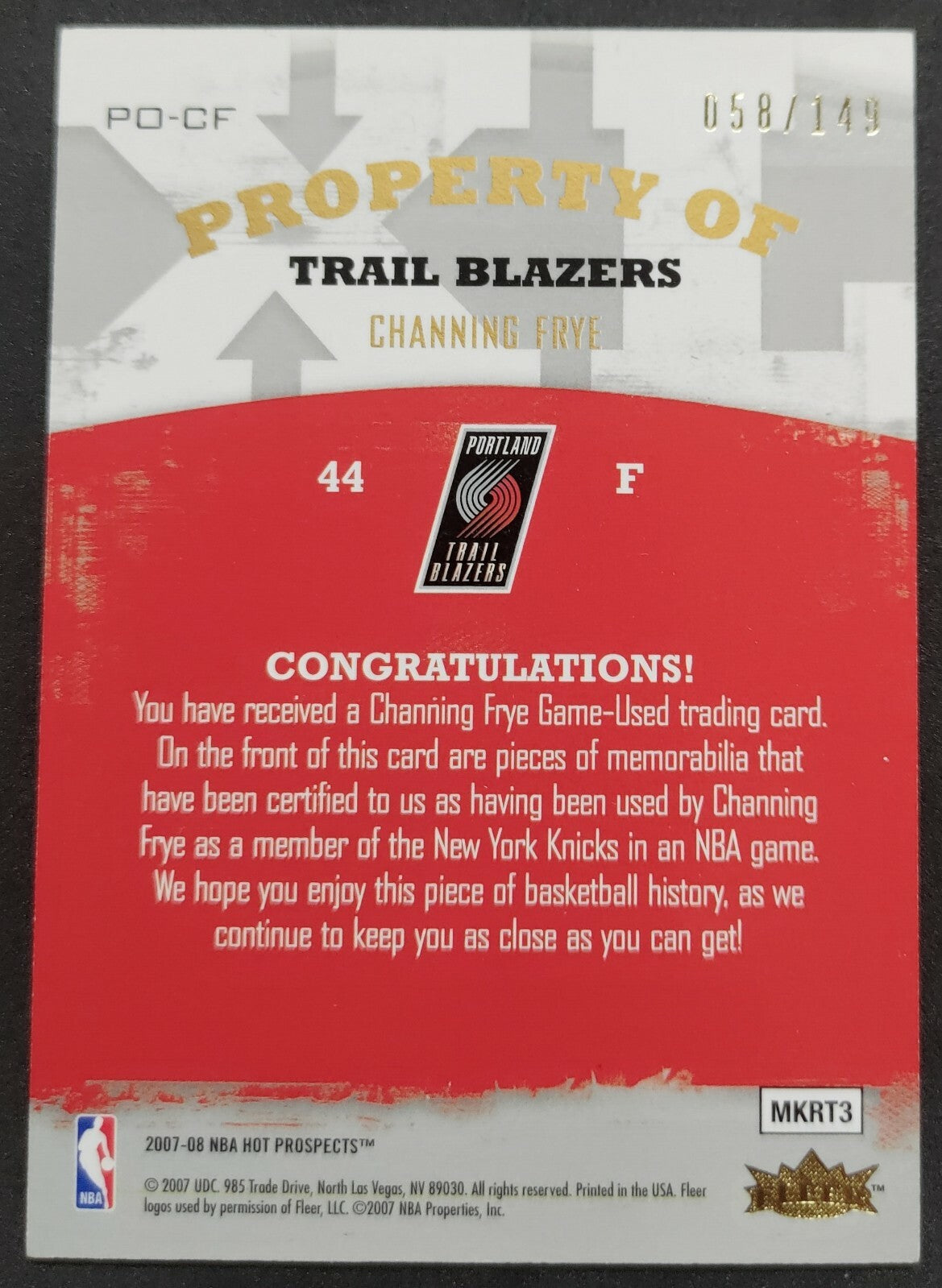 NBA - 2007-08 Fleer Hot Prospects - Channing Frye 058/149 Patch Card. Card is in NM condition, however, please use...