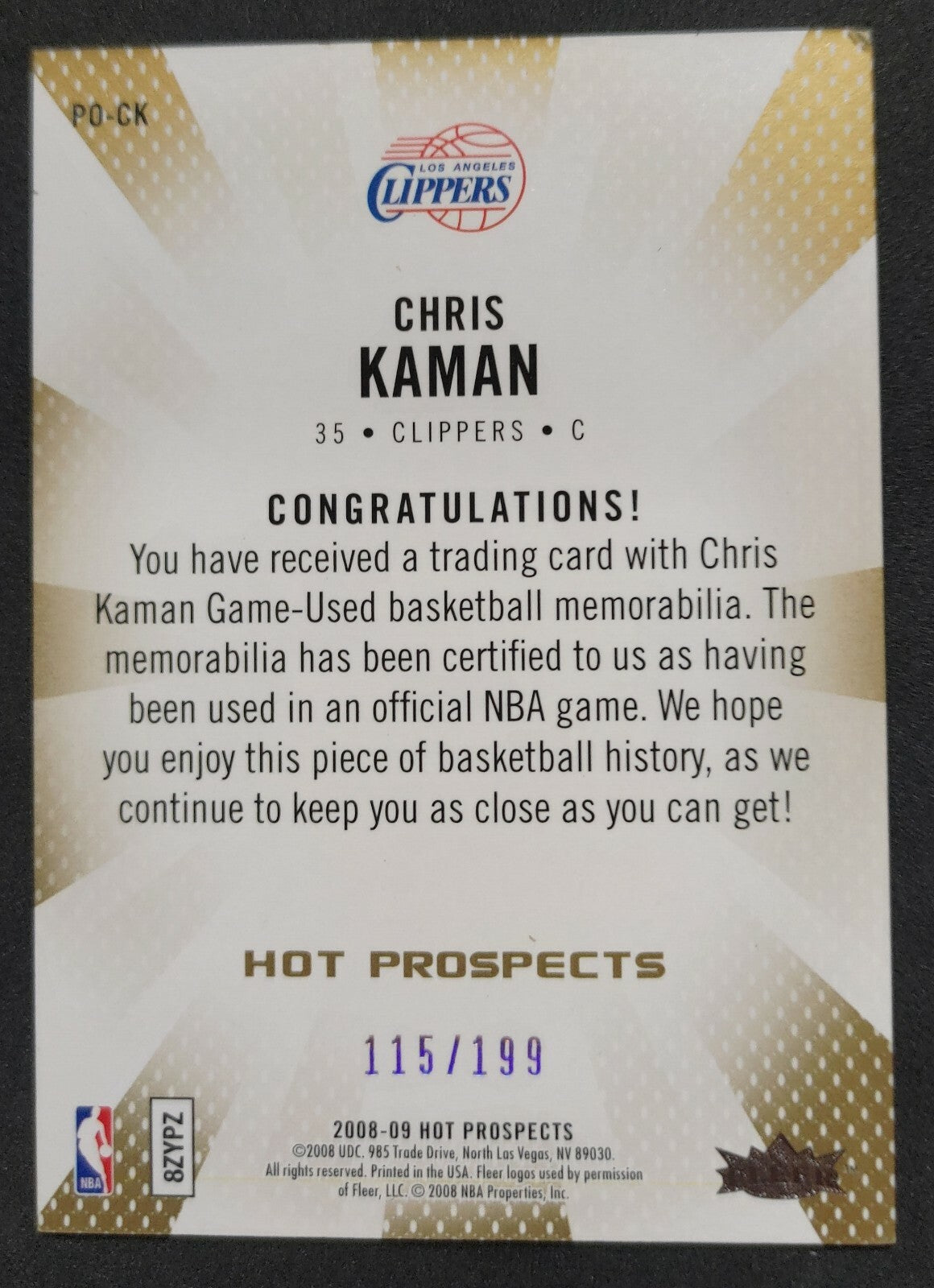 NBA - 2008-09 Fleer Hot Prospects XXL Property Of - Chris Kaman 115/199 Card. Card is in NM condition, however,...