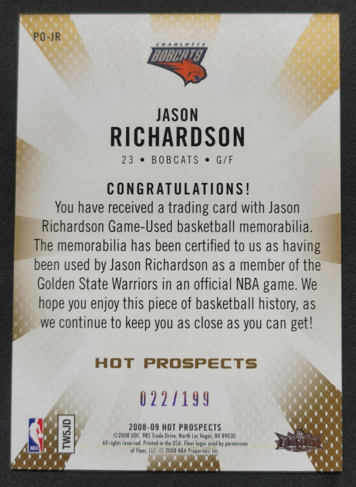 NBA - 2008-09 Fleer Hot Prospects XXL Property Of - Jason Richardson 022/199 Card. Card is in NM condition, however,...