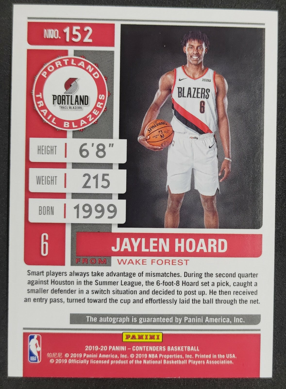 NBA - 2019 - 20 Panini Contenders Jaylen Hoard Rookie Ticket Autographed Card. Card will be sent sleeved and in...