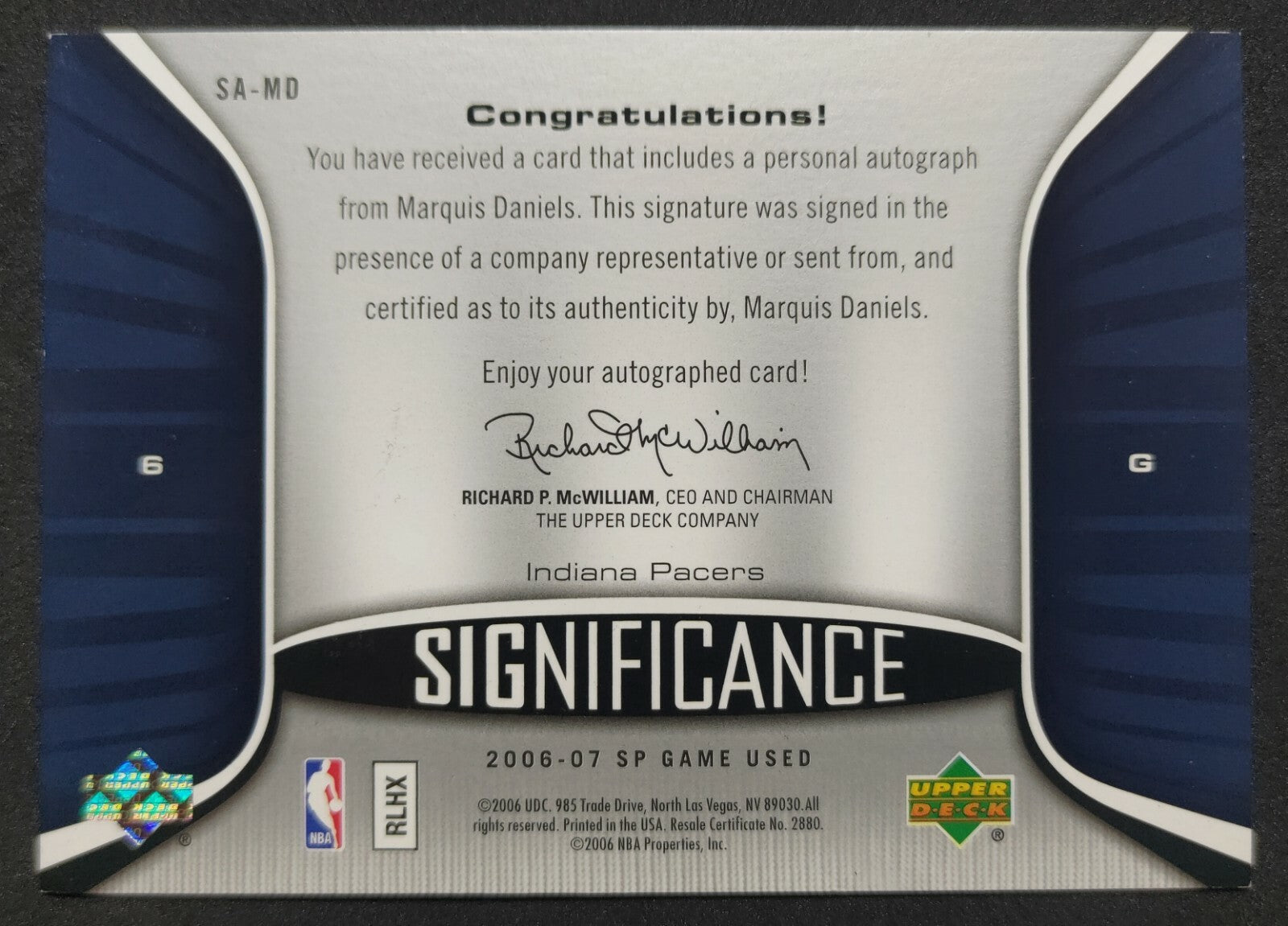 NBA - Marquis Daniels 2006-07 SP Game Used SIGnificance Signed Card 068/100. Card is in NM condition, however, please use...