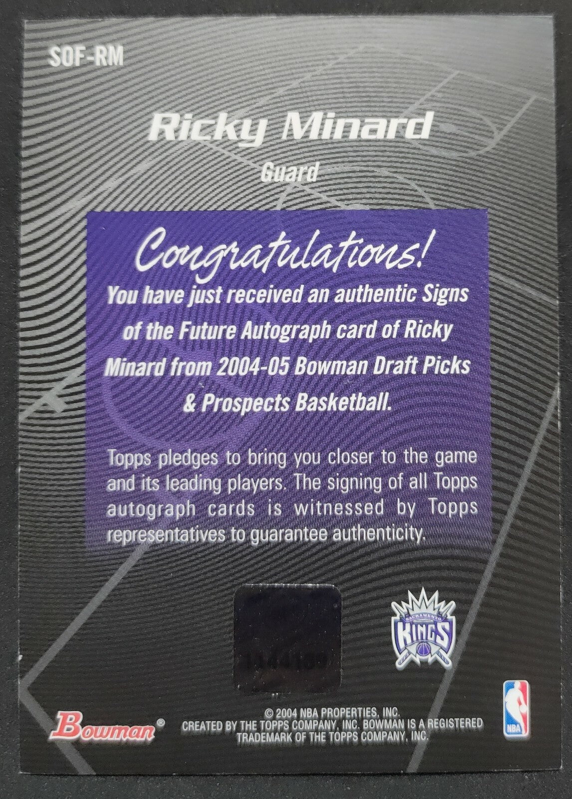 NBA - 2004 Bowman Signs Of The Future - Ricky Minard Autographed Card. Card is in NM condition, however, please...