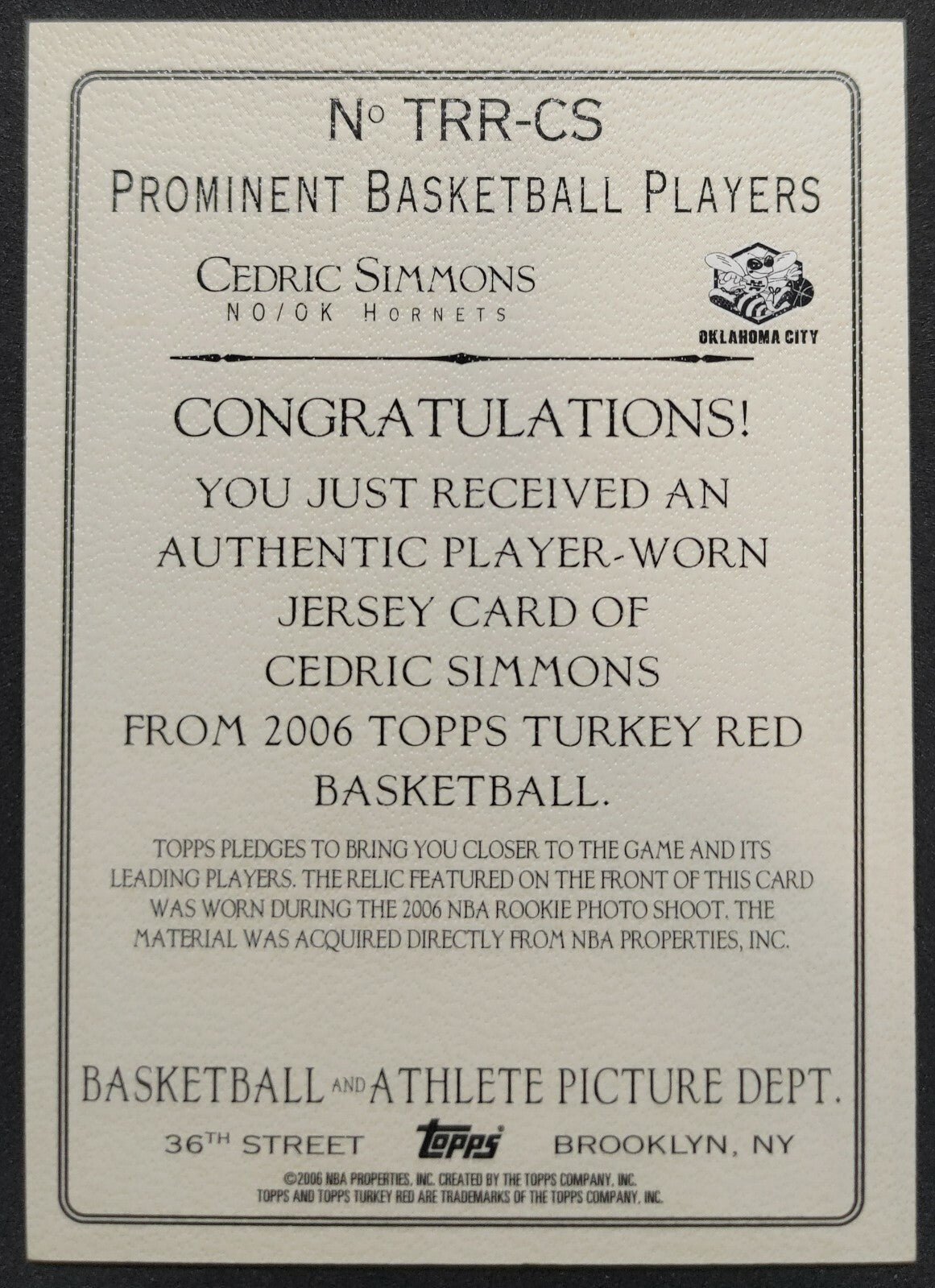 NBA - 2006 Topps Turkey Red Cedric Simmons Patch Card. Card is in NM condition, however, please use photos to...