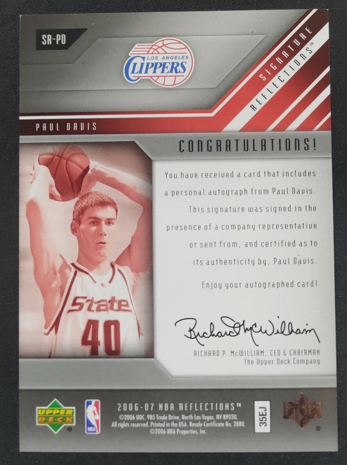 NBA - 2006-07 Reflections Paul Davis Autographed Card. Card is in NM condition, however, please use photos to assess condition...