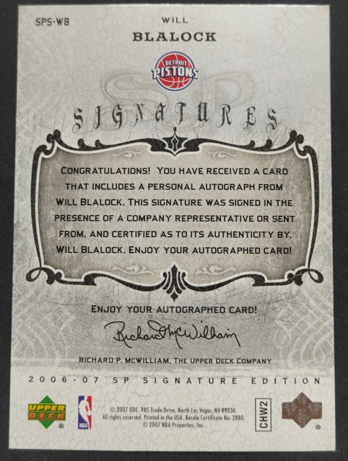 NBA - 2006-07 SP Signatures - Will Blalock Autograph Card. Card is in NM condition, however, please use photos to...