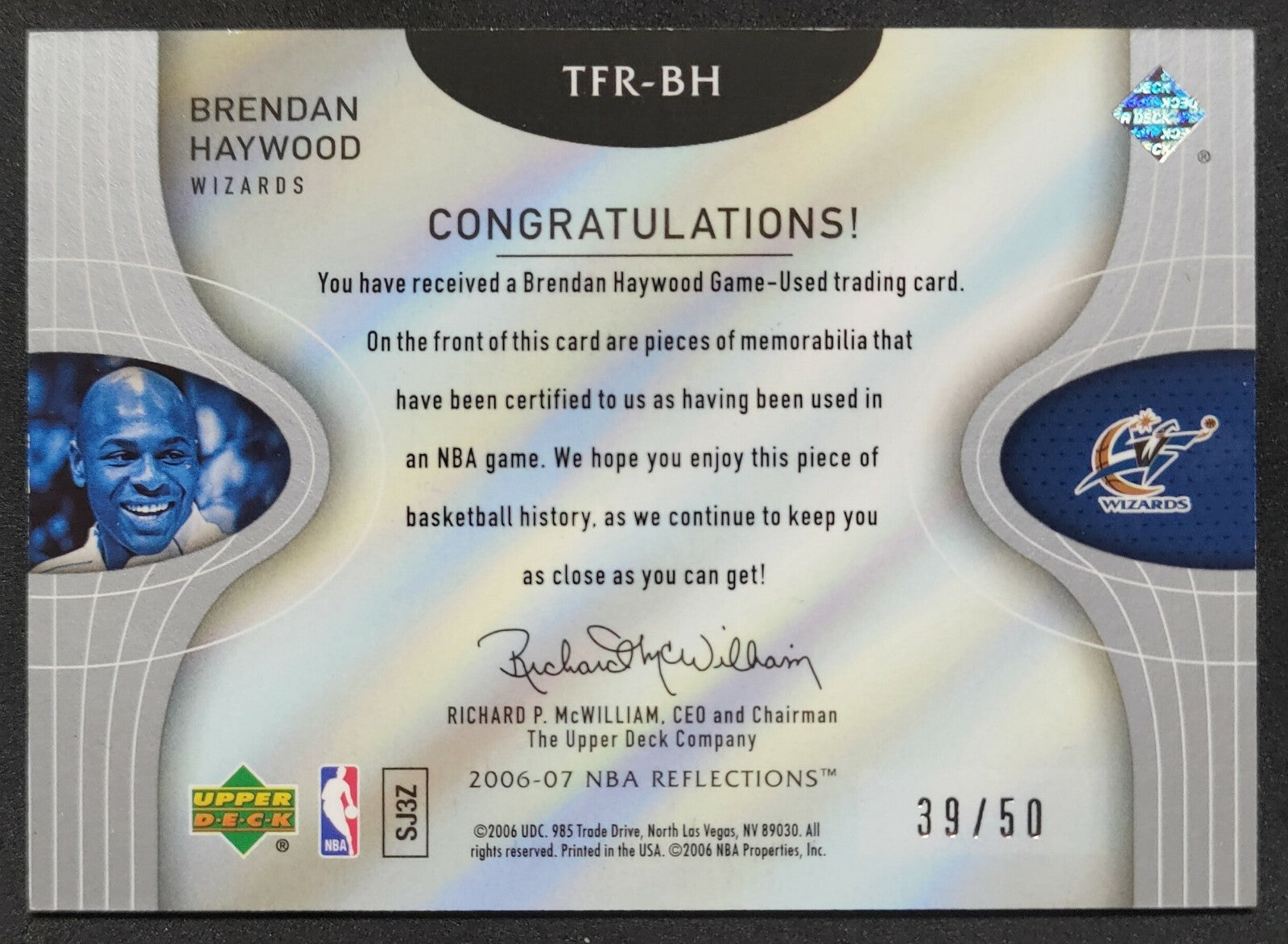 NBA - 2006-07 Reflections Triple Fabric Reflections - Brendan Haywood 39/50 Triple Patch Card. Card is in NM condition, however...