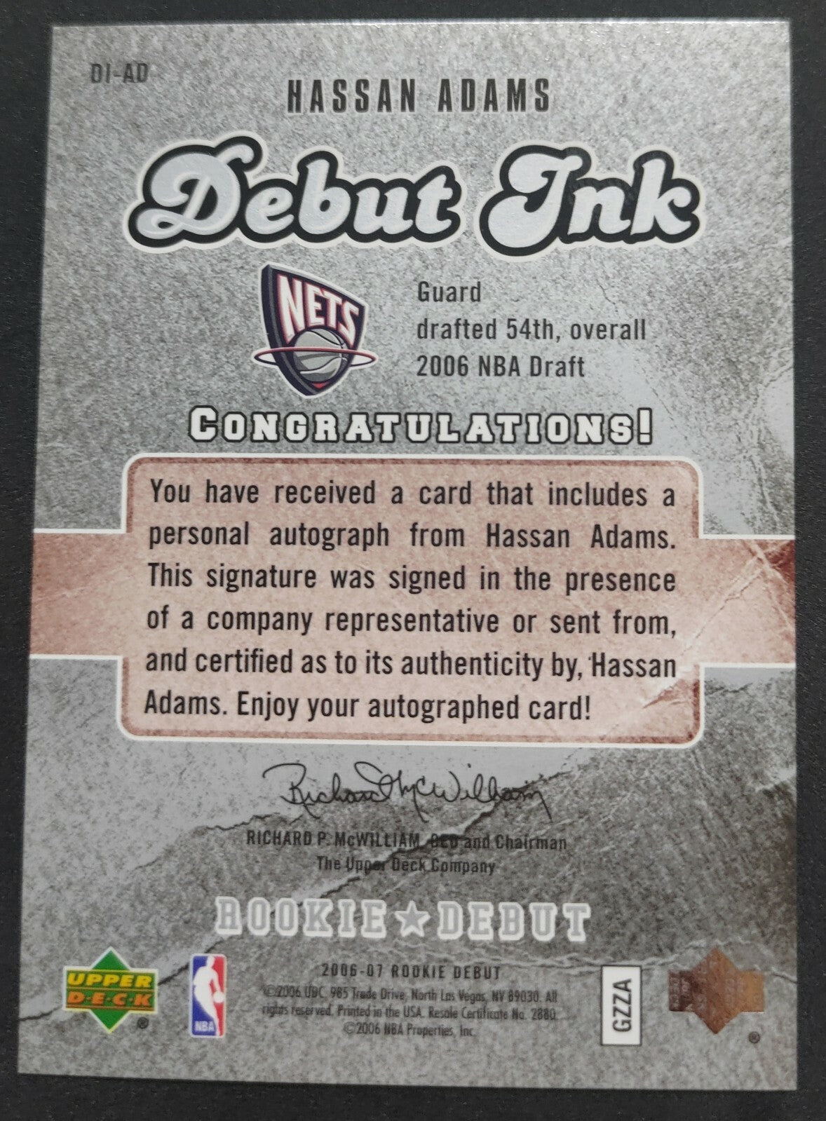 NBA - 2006-07 Upper Deck Rookie Debut - Hassan Adams Autographed Card. Card is in NM condition, however, please use...