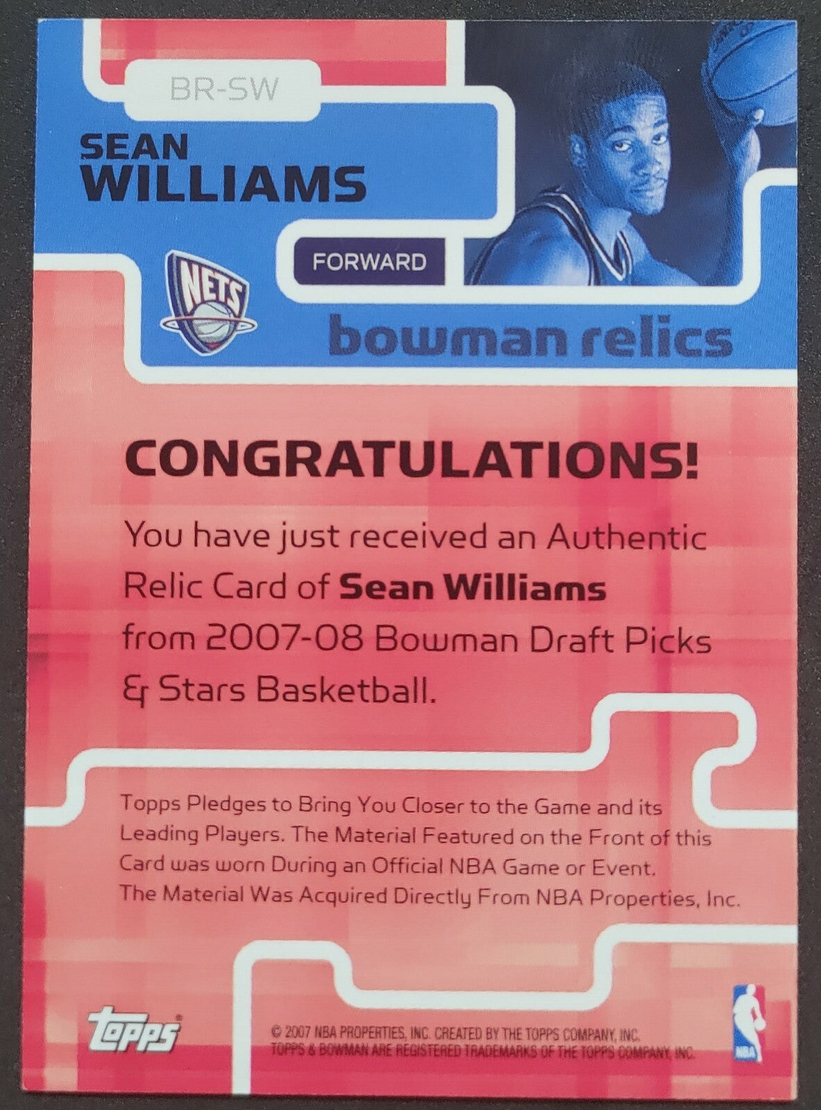 NBA - 2007 Topps Bowman Relics - Sean Williams Patch Card. Card is in NM condition, however, please use photos...