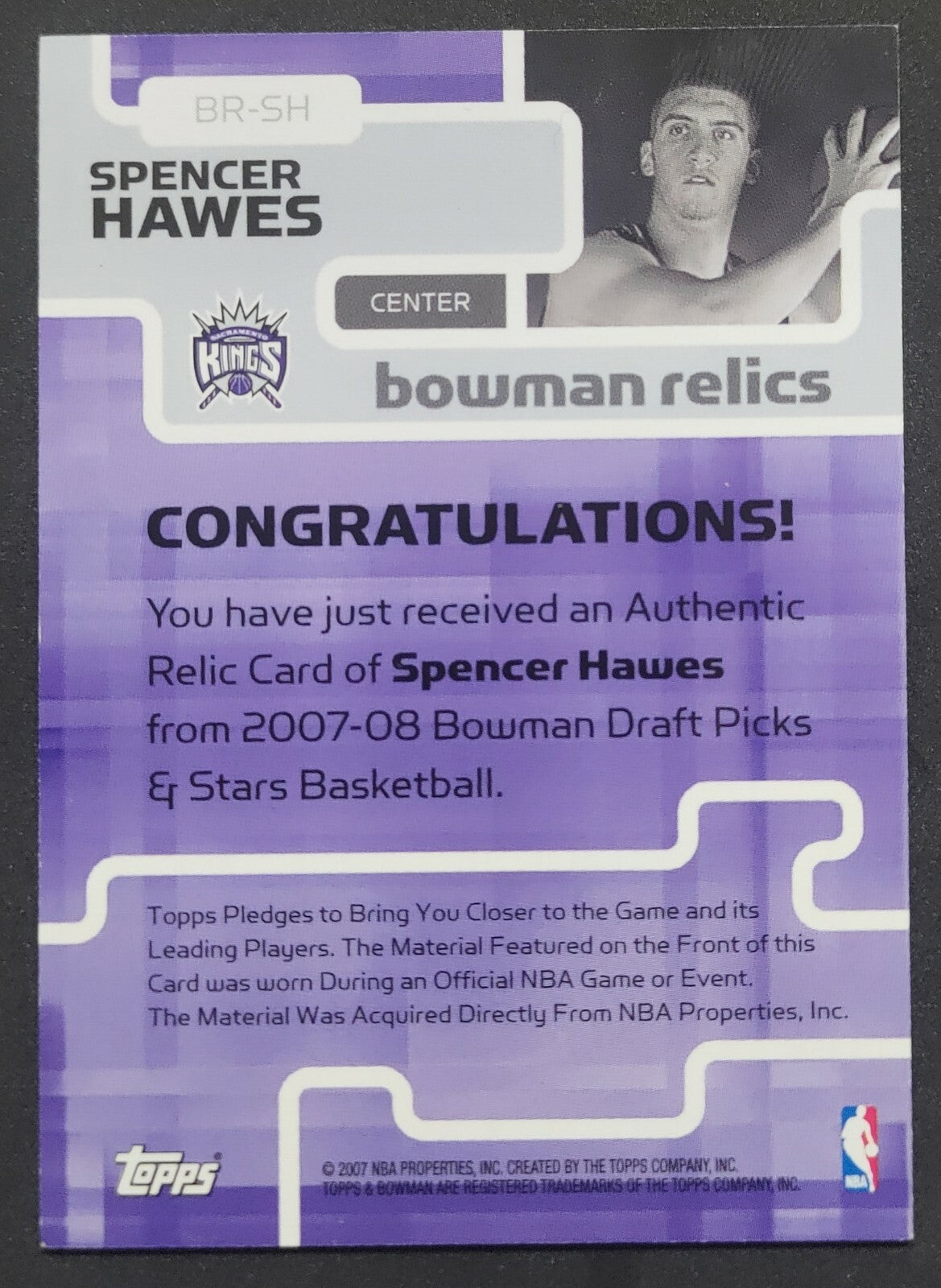 NBA - 2007 Topps Bowman Relics - Spencer Hawes Patch Card. Card is in NM condition, however, please use photos...